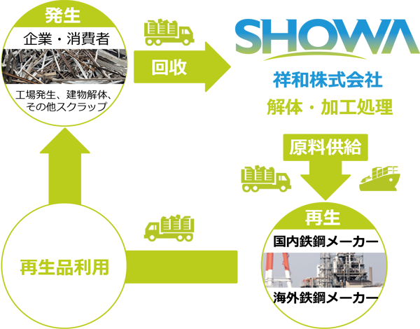 当社で集荷・加工された鉄スクラップは、製鋼原料として、国内メーカーのみならず、 アジアを中心とした各地に輸出され、リサイクル原料として幅広く使用されています。